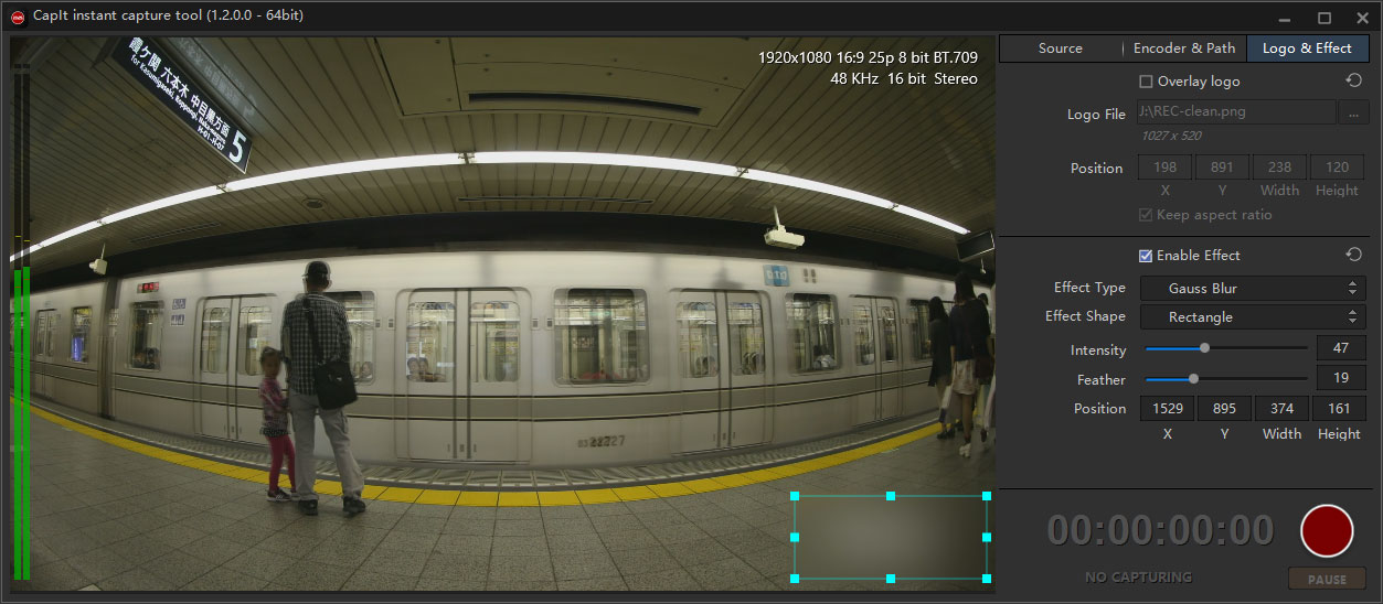 Use these settings during recording to apply a Gaussian blur or mosaic filter to the selected area. The recorded file will immediately contain the blurred or pixelated result in that region. This is particularly useful for data protection scenarios where certain areas must not be captured at all.